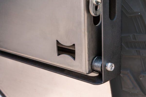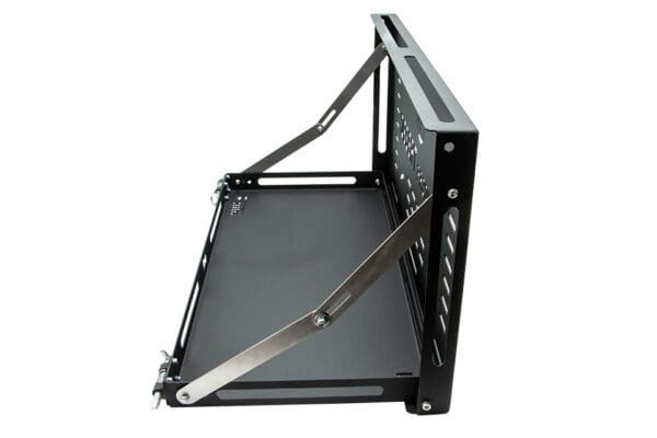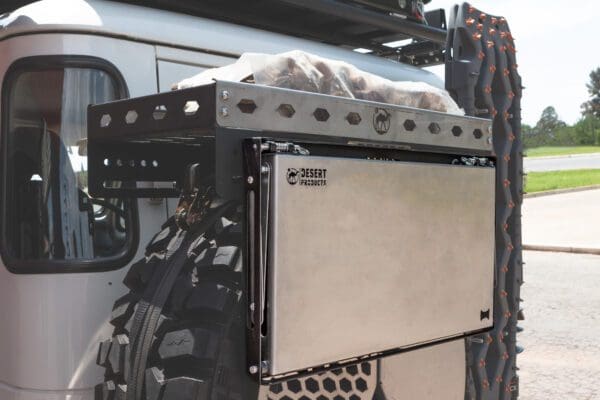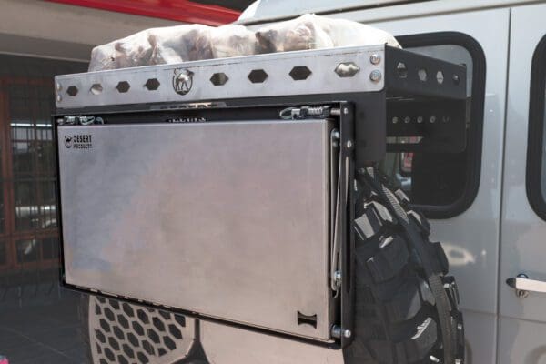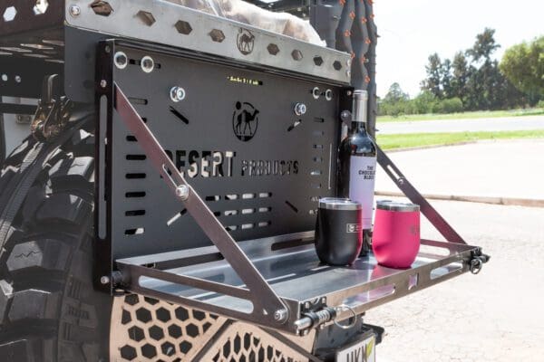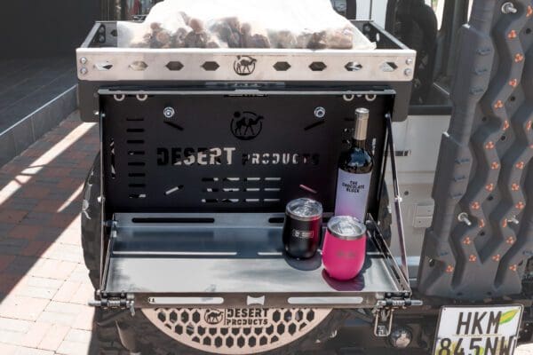 This versatile drop down table quickly attaches to the spare wheel at the back of your 4WD, or on the outside of your canopy and provides a handy work surface. Packs flat, so you can easily store it away when not in use!  Note:  Excludes spare wheel firewood carrier on top of wheel.