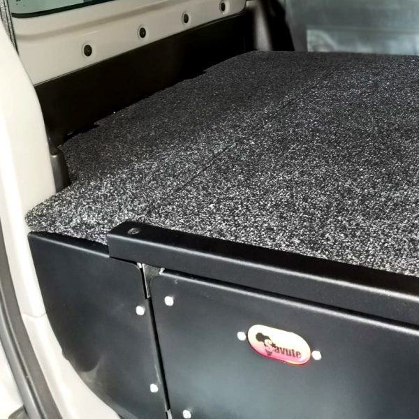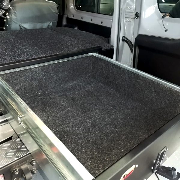 Jimny Gen 4 (3 Door) – A single drawer made to make use of the maximum available space in the loadbay of your Suzuki Jimny. The top of the drawer is flush with the top of the wheelarch. Uses Heavy Duty telescopic sliders allowing the drawer to open out all the way. The sliders can handle up to 116kg per pair at 60% travel – you will have to try very hard to overload this drawer. The drawer is also fully lockable. Please note that the rear seats must be removed to accomodate the drawer.