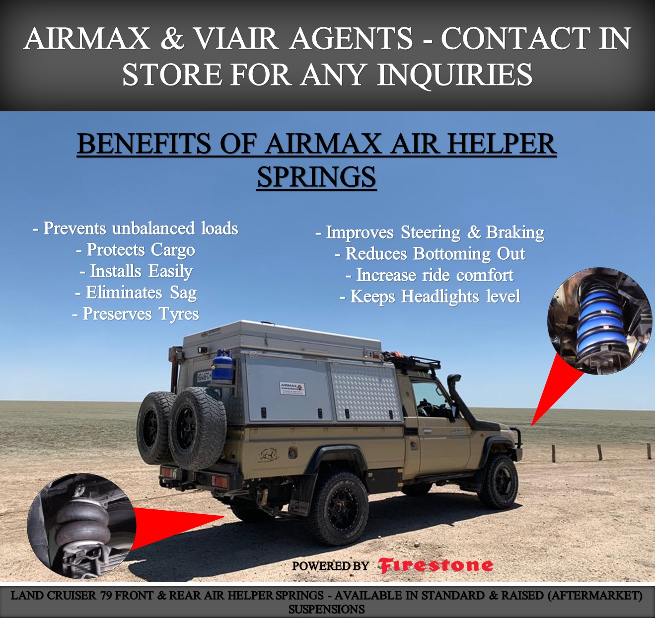 Firestone Air Helper are designed to improve load support, stability, and ride comfort for bakkies and 4×4 vehicles. Ideal for towing, carrying heavy loads, and overlanding, Firestone air helpers reduce sag, improve handling, and help maintain correct ride height. Adjustable air pressure allows you to tailor your suspension for daily driving or heavy-duty use, making Firestone a trusted solution for work and adventure vehicles.